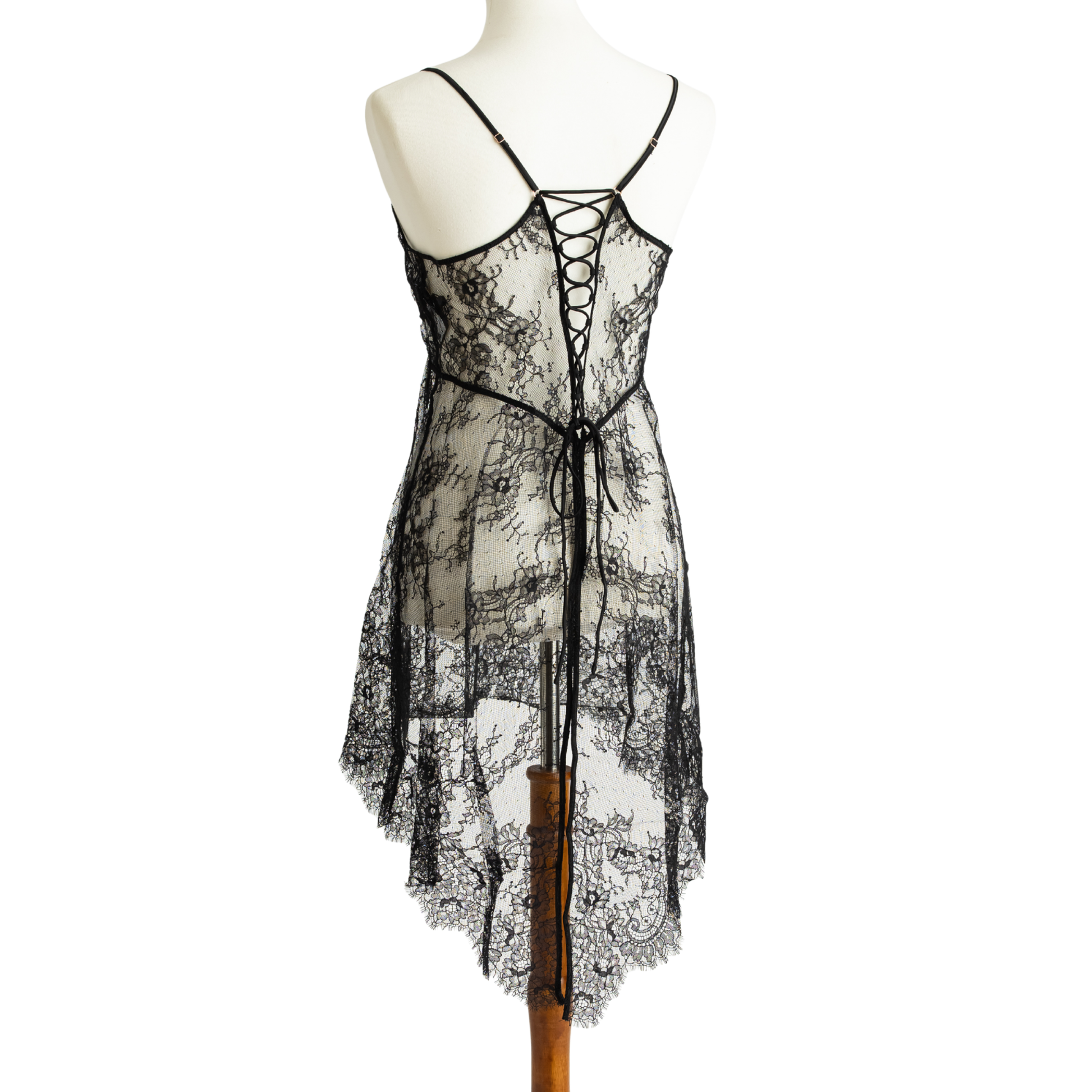 This must-have chemise for lingerie enthusiasts is crafted from delicate Chantilly-type lace. A unique high-low hem reveals a center back slit that transforms into a captivating lace-up detail, while the plunging neckline and unlined cups keep things irresistibly alluring. Adjustable shoulder straps ensure a custom fit. Details in rose gold color.