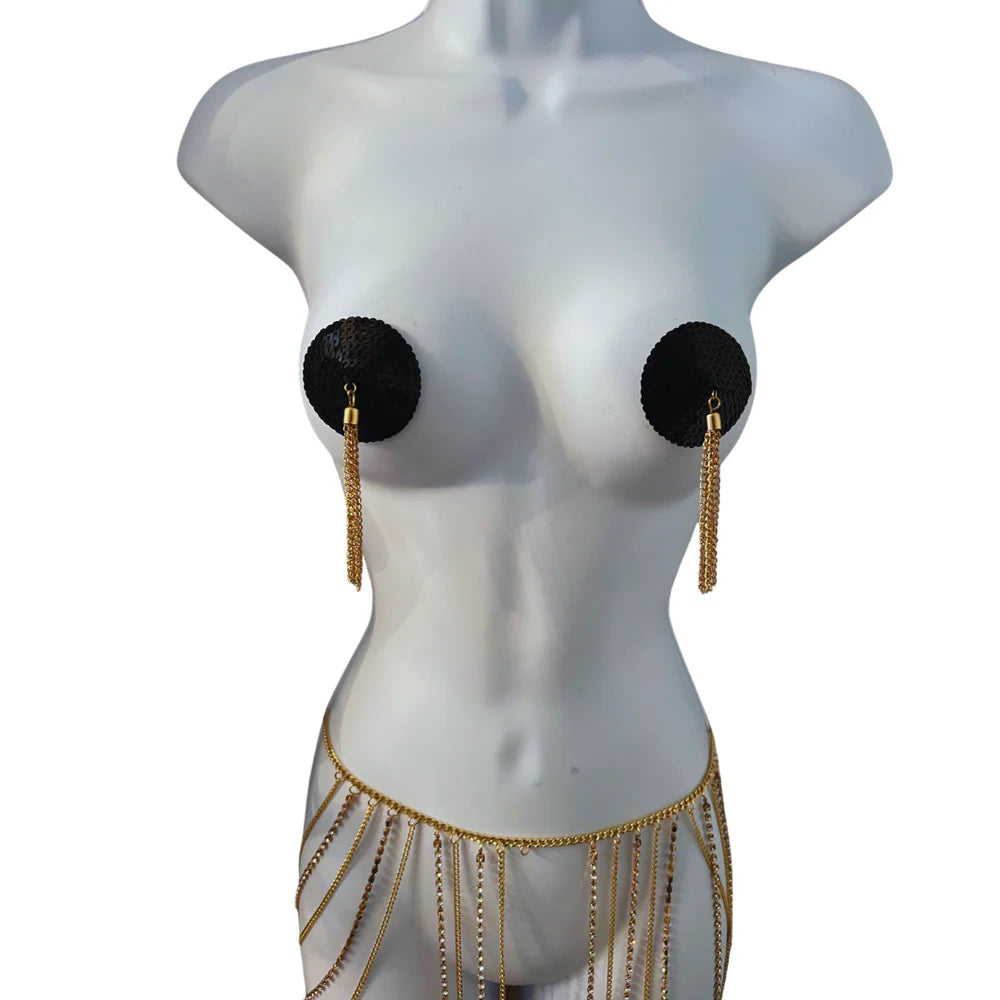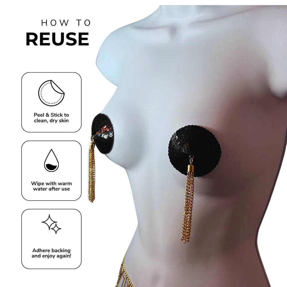 These black sequin MIDNIGHT MIRAGE pasties are at the peak of peek-a-boo chic. Our new mesmerizing black and silver nipple pasties, a design so captivating it's as enigmatic as you are. Prepare to make a statement with these stunning pasties that blend elegance with allure.