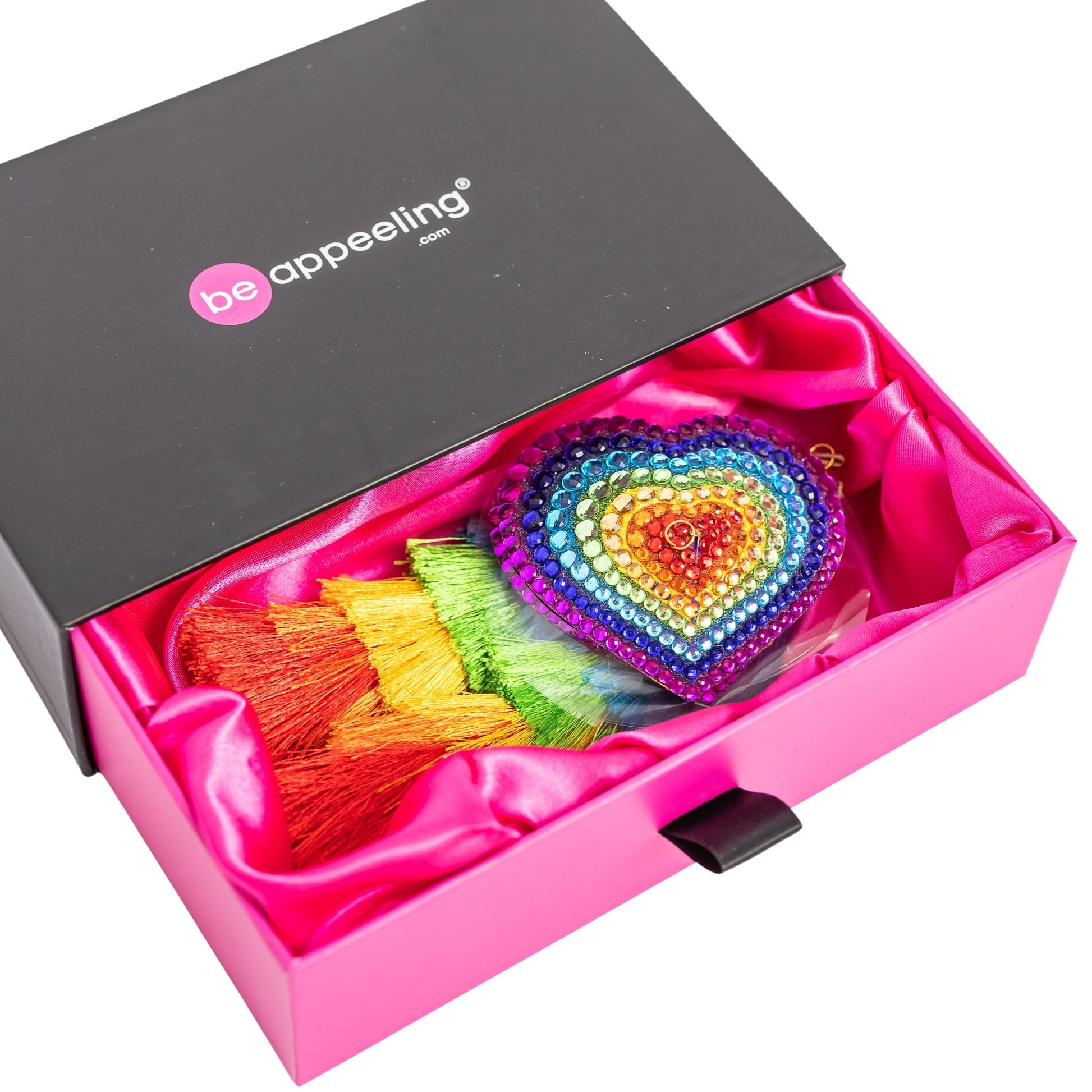 Decked out in the dazzling colors of the Pride flag, these heart-shaped pasties feature outrageously gorgeous, eye-catching rainbow tassels that twirl with every move. Whether you're commanding the stage or simply bringing the sparkle to any celebration, these pasties are made to make you shine.