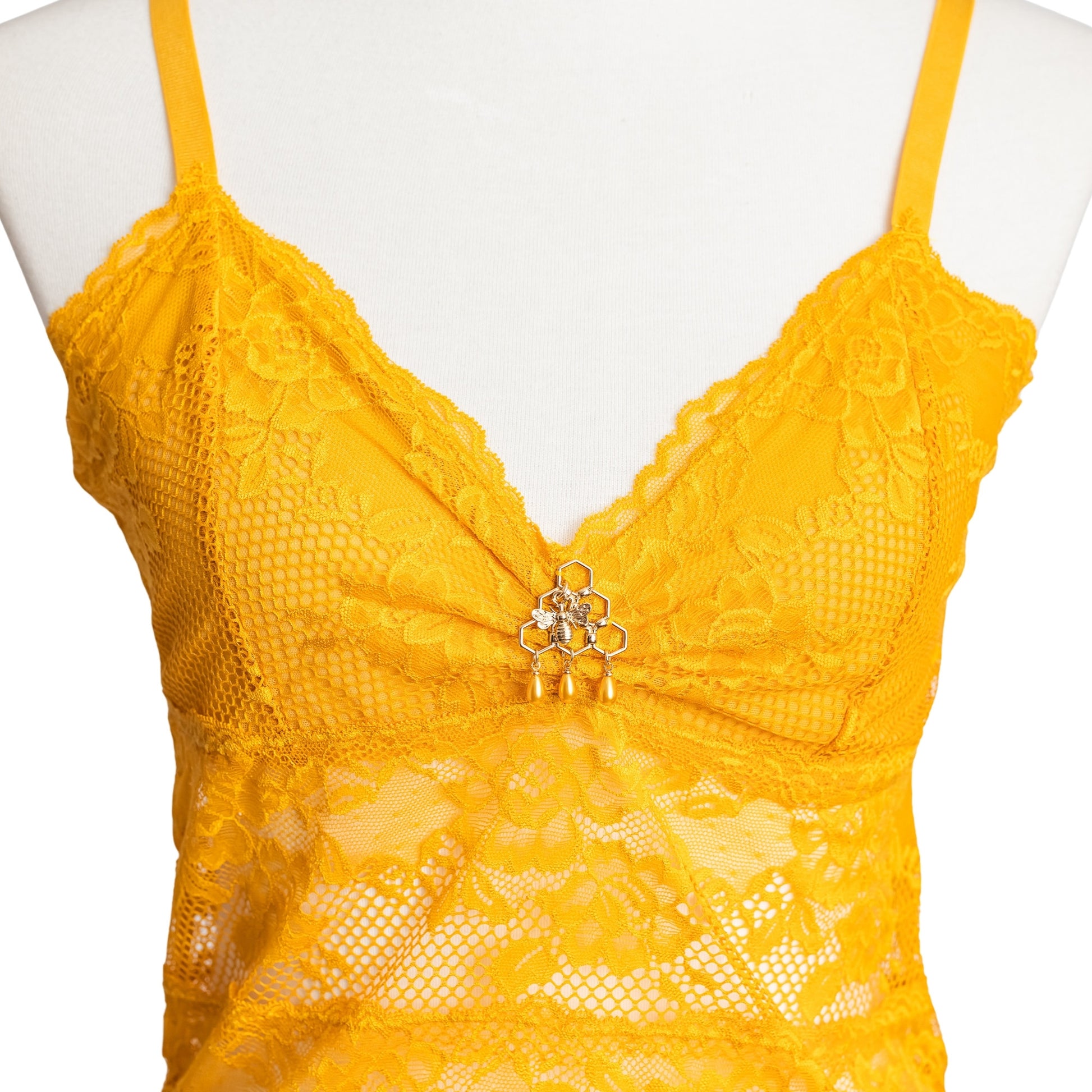 Wrapped in resplendent golden lace and kissed by the essence of honey, this slip dress will awaken your inner monarch. Meticulously crafted from the most luxuriously soft, stretchable gold lace, this slip dress showcases an exquisite honeycomb-shaped front clasp, embellished with opulent golden pearl droplets that shimmer like glistening drops of honey under the sun. It's a true ode to life's most indulgent pleasures!