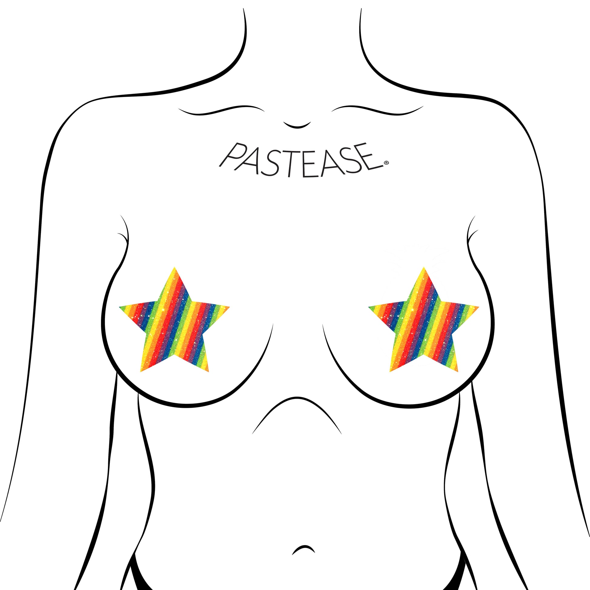 Glittering Rainbow Star Nipple Pasties by Pastease are hand-made in the USA of super soft swimsuit material with checker print that forms to curves and resists wrinkling over hardening nipples. Just peel-and-stick on clean, dry skin.